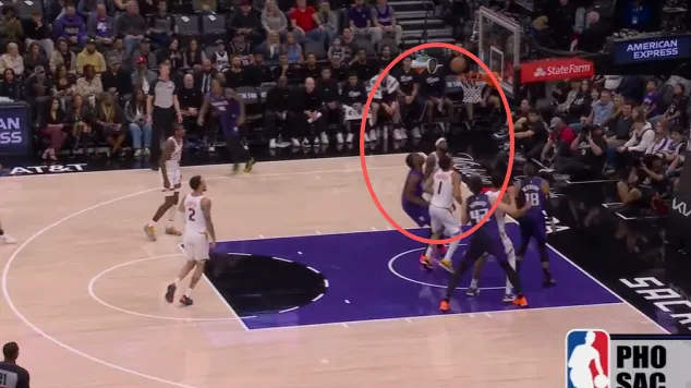 克利福德翻身后仰强投被帽,阿丘瓦拿到地板球后面对前来扑防的布克:先是虚晃,